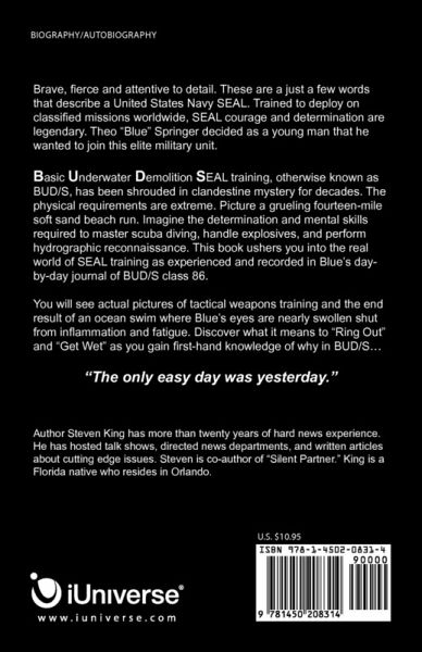 Brazen, irreverent, and unforgiving, the unpredictable Navy SEALs deploy on classified missions worldwide. Theodis "Blue" Springer, decided as a young man that he wanted to join this elite military unit. The path through Basic Underwater Demolition SEAL training is excruciating and has been shrouded in clandestine mystery. Discover what it means to "Ring Out" and "Get Wet" through the eyes of Blue the Black Fish, an actual day-by-day journal of BUD/S class # 86. The physical requirements are extreme, picture a fourteen-mile, soft sand beach run. Glimpse the mental skills required to master scuba diving, handle explosives, and perform hydrographic reconnaissance. You will see the pictures of weapons training and the end result of a five-mile ocean swim where Blue's eyes are nearly swollen shut from inflammation and fatigue. Enter the real world of US Navy SEAL training where "the only easy day was yesterday."