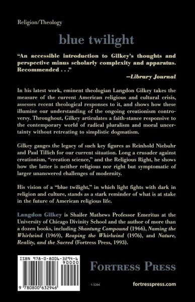 Gilkey's latest work takes the measure of the current American religious and cultural crisis, assesses recent theological responses to it, and shows how these illumine our understanding of the ongoing creationism controversy. Throughout, Gilkey articulates a faith-stance responsive to the contemporary world of radical pluralism and moral uncertainity without retreating to simplistic dogmatism. Gilkey's vision of a "blue twilight" in which light fights with dark in religion and culture, stands as a stark reminder of what is at stake in the future of American religious life.