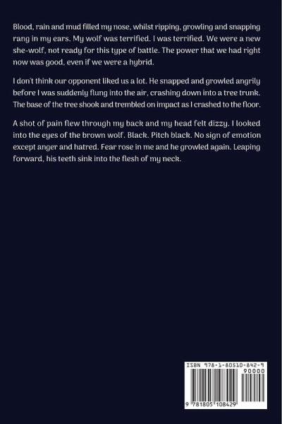 Blood, rain and mud filled my nose, whilst ripping, growling and snapping rang in my ears. My wolf was terrified. I was terrified. We were a new she-wolf, not ready for this type of battle. The power that we had right now was good, even if we were a hybrid. I don't think our opponent liked us a lot. He snapped and growled angrily before I was suddenly flung into the air, crashing down into a tree trunk. The base of the tree shook and trembled on impact as I crashed to the floor. A shot of pain flew through my back and my head felt dizzy. I looked into the eyes of the brown wolf. Black. Pitch black. No sign of emotion except anger and hatred. Fear rose in me and he growled again. Leaping forward, his teeth sink into the flesh of my neck.
