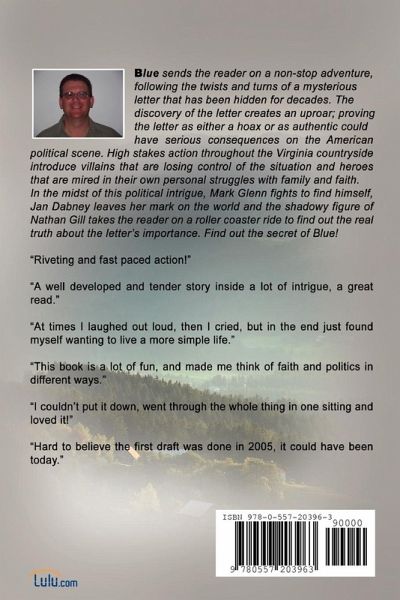 Blue sends the reader on a non-stop adventure, following the twists and turns of a mysterious letter that has been hidden for decades in a valuable painting. The discovery of this letter creates an uproar, proving the letter as either a hoax or as authentic could have serious consequences on the American political scene. High stakes action throughout the Virginia countryside introduce villains that are losing control of the situation and heroes that are mired in their own personal struggles with family and faith. In the midst of this political intrigue, Mark Glenn fights to find himself, Jan Dabney leaves her mark on the world and the shadowy figure of Nathan Gill takes the reader to the very last pages to find out the real truth about the letter's importance.