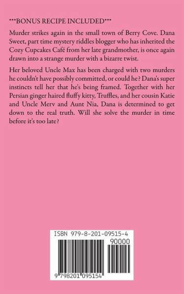 ***BONUS RECIPE INCLUDED*** Murder strikes again in the small town of Berry Cove. Dana Sweet, part time mystery riddles blogger who has inherited the Cozy Cupcakes Café from her late grandmother, is once again drawn into a strange murder with a bizarre twist. Her beloved Uncle Max has been charged with two murders he couldn't have possibly committed, or could he? Dana's super instincts tell her that he's being framed. Together with her Persian ginger haired fluffy kitty, Truffles, and her cousin Katie and Uncle Merv and Aunt Nia, Dana is determined to get down to the real truth. Will she solve the murder in time before it's too late? A Dana Sweet Cozy Mystery series: Strawberry Cream Cupcake & Murder (Book 1) Blueberry Cream Cupcake & Murder (Book 2) Chocolate Cream Cupcake & Murder (Book 3) Strawberry Meringue Cupcake & Murder (Book 3.5) * Bonus Short Story Vanilla Cream Cupcake & Murder (Book 4) Holiday Cream Cupcake & Murder (Book 5) Valentine's Cupcake & Murder (Book 6) Buttercream Cupcake & Murder (Book 7) Coconut Cream Cupcake & Murder (Book 8) Cherry Cream Cupcake & Murder (Book 9) Chocolate Chip Cupcake & Murder (Book 10)