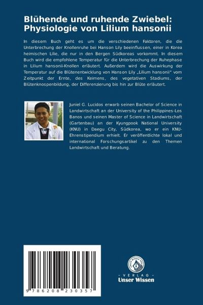 In diesem Buch geht es um die verschiedenen Faktoren, die die Unterbrechung der Knollenruhe bei Hanson Lily beeinflussen, einer in Korea heimischen Lilie, die nur in den Bergen Südkoreas vorkommt. In diesem Buch wird die empfohlene Temperatur für die Unterbrechung der Ruhephase in Lilium hansonii-Knollen erläutert. Außerdem wird die Auswirkung der Temperatur auf die Blütenentwicklung von Hanson Lily "Lilium hansonii" vom Zeitpunkt der Ernte, des Keimens, des vegetativen Stadiums, der Blütenknospenbildung, der Differenzierung bis hin zur Blüte erläutert.