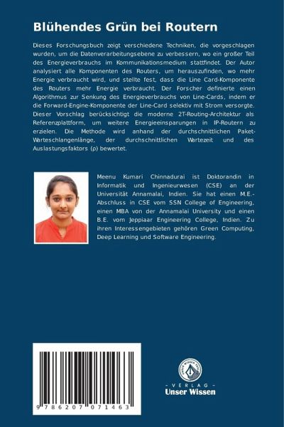 Dieses Forschungsbuch zeigt verschiedene Techniken, die vorgeschlagen wurden, um die Datenverarbeitungsebene zu verbessern, wo ein großer Teil des Energieverbrauchs im Kommunikationsmedium stattfindet. Der Autor analysiert alle Komponenten des Routers, um herauszufinden, wo mehr Energie verbraucht wird, und stellte fest, dass die Line Card-Komponente des Routers mehr Energie verbraucht. Der Forscher definierte einen Algorithmus zur Senkung des Energieverbrauchs von Line-Cards, indem er die Forward-Engine-Komponente der Line-Card selektiv mit Strom versorgte. Dieser Vorschlag berücksichtigt die moderne 2T-Routing-Architektur als Referenzplattform, um weitere Energieeinsparungen in IP-Routern zu erzielen. Die Methode wird anhand der durchschnittlichen Paket-Warteschlangenlänge, der durchschnittlichen Wartezeit und des Auslastungsfaktors ( ) bewertet.