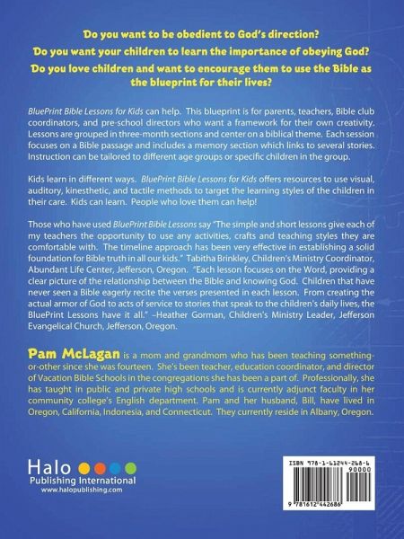 BluePrint Bible Lessons for Kids can help. This blueprint is for parents, teachers, Bible club coordinators, and pre-school directors who want a framework for their own creativity. Lessons are grouped in three-month sections and center on a biblical theme. Each session focuses on a Bible passage and includes a memory section which links to several stories. Instruction can be tailored to different age groups or specific children in the group. Children learn in different ways. BluePrint Bible Lessons for Kids provides resources to facilitate understanding for visual, auditory, kinesthetic, and tactile learners and offers creative ways to make your home or classroom a fun place where knowledge abounds. Choose from the abundance of ideas found in BluePrint Bible Lessons for Kids.