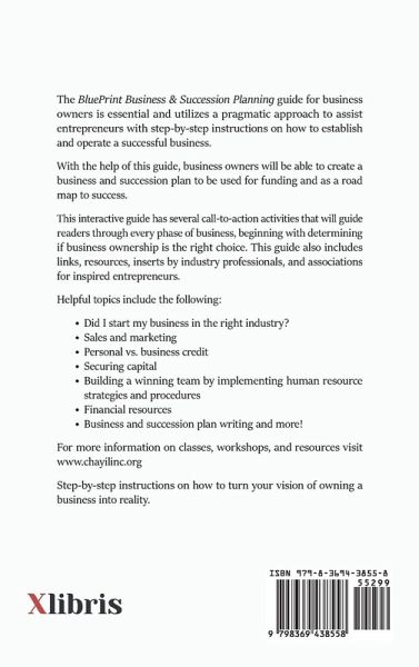 The BluePrint Business & Succession Planning guide for business owners is essential and utilizes a pragmatic approach to assist entrepreneurs with step-by-step instructions on how to establish and operate a successful business. With the help of this guide, business owners will be able to create a business and succession plan to be used for funding and as a road map to success. This interactive guide has several call-to-action activities that will guide readers through every phase of business, beginning with determining if business ownership is the right choice. This guide also includes links, resources, inserts by industry professionals, and associations for inspired entrepreneurs. Helpful topics include the following: Did I start my business in the right industry? Sales and marketing Personal vs. business credit Securing capital Building a winning team by implementing human resource strategies and procedures Financial resources Business and succession plan writing and more! For more information on classes, workshops, and resources visit www.chayilinc.org Step-by-step instructions on how to turn your vision of owning a business into reality.