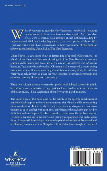 What if, for more than fifty years, you worked hard to research the New Testament without denominational filters? And then what if you were to organize that research by subject matter? Well, that is what I have done in these two volumes of "Blueprint for a Revolution: Building Upon ALL of The New Testament." What follows is a catechism of apostolic, true Christianity. It is a body of teaching that flows out of taking all New Testament teachings in a grammatically natural and literal sense, the way we instinctively read all serious literature. Testimony from the earliest Christians is also presented, demonstrating that what those earliest churches taught and lived out was typically identical to what you conclude when you take the New Testament doctrines, commands and promises in that same sense. In those many years of research, I have never come upon a single church or book that provides a specific set of principles (a.k.a., "exegetical method") by which all Biblical passages are to be interpreted, and that has then set about to consistently surrender to those principles in all the subjects that it covers. My claim, therefore, is that this is the only such catechetical work that does just that. The importance of this book does not lie mainly in the specific conclusions of any individual chapter, and certainly not in any of my literally skills at presenting those conclusions. It lies largely in the juxtaposition of teachings that are often thought to be in conflict with each other only because the traditions that hold to the beliefs in those chapters have been in conflict with each other. It is my contention that what Jesus considered to be "my church" is what is taught within these chapters, the church that is an incarnation of His "kingdom of God"!