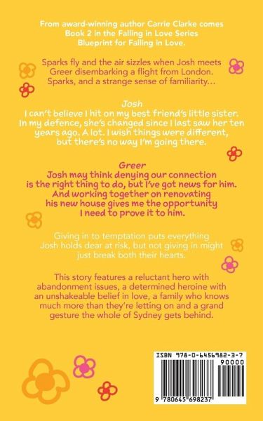 From award-winning author Carrie Clarke comes Book 2 in the Falling in Love Series-Blueprint for Falling in Love Sparks fly and the air sizzles when Josh meets Greer disembarking a flight from London. Sparks, and a strange sense of familiarity... Josh I can't believe I hit on my best friend's little sister. In my defence, she's changed since I last saw her ten years ago. A lot. I wish things were different, but there's no way I'm going there. Greer Josh may think denying our connection is the right thing to do, but I've got news for him. And working together on renovating his new house gives me the opportunity I need to prove it to him. Giving in to temptation puts everything Josh holds dear at risk, but not giving in might just break both their hearts. This story features a reluctant hero with abandonment issues, a determined heroine with an unshakeable belief in love, a family who knows much more than they're letting on and a grand gesture the whole of Sydney gets behind. Author's Note: Blueprint for Falling in Love is Book 2 in the Falling in Love Series, but it can be read as a standalone and has a guaranteed HEA. Warning: if you like dual POV, tattooed heroes, slightly dysfunctional found families, red headed heroines, accidental flirting and lots of adult cuddles, you may need a fan or a cold shower after reading.