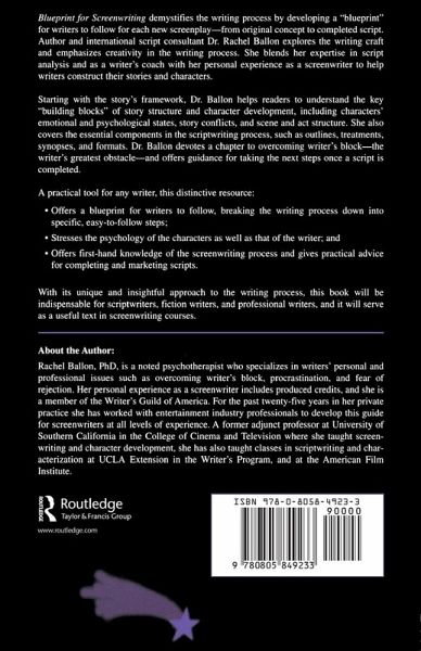 Blueprint for Screenwriting demystifies the writing process by developing a "blueprint" for writers to follow for each new screenplay--from original concept to completed script. Author and international script consultant Dr. Rachel Ballon explores the writing craft and emphasizes creativity in the writing process. She blends her expertise in script analysis and writing coaching with her personal experience as a screenwriter to help writers construct their stories and characters. Starting with the story's framework, Dr. Ballon helps readers to understand the key "building blocks" of story structure and character development, including characters' emotional and psychological states, story conflicts, and scene and act structure. She also covers the essential components in the script writing process, such as outlines, script treatments, synopses, and formats. Dr. Ballon devotes a chapter to overcoming writer's block--the writer's greatest obstacle--and offers guidance for taking the next steps once a script is completed. A practical tool for any writer, this distinctive resource: *offers a blueprint for writers to follow, breaking the writing process down into specific, easy-to-follow steps; *stresses the psychology of the characters as well as that of the writer; and *offers first-hand knowledge of the screenwriting process and gives practical advice for completing and marketing scripts. With its unique and insightful approach to the writing process, this book will be indispensable for scriptwriters, fiction writers, and professional writers, and it will serve as a useful text in screenwriting courses.