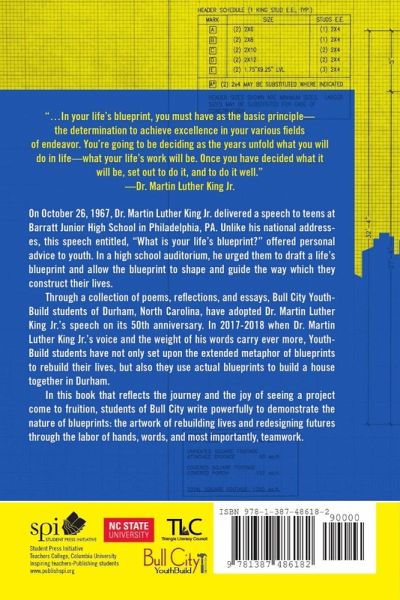 On October 26, 1967, Dr. Martin Luther King Jr. delivered a speech to teens at Barratt Junior High School in Philadelphia, PA. Unlike his national addresses, this speech entitled, "What is your life's blueprint?" offered personal advice to youth during a crucial part in their lives. In a high school auditorium, he urged them to draft a life's blueprint and allow the blueprint to shape and guide the way which they construct their lives. In this collection of narratives and essays, Bull City YouthBuild students of Durham, North Carolina, have adopted Dr. Martin Luther King Jr.'s speech on its 50th anniversary. In 2017 when Dr. Martin Luther King Jr.'s voice and the weight of his words carry ever more, YouthBuild students have not only set upon the extended metaphor of blueprints to rebuild their lives, but also they use actual blueprints to build a house together in Durham.