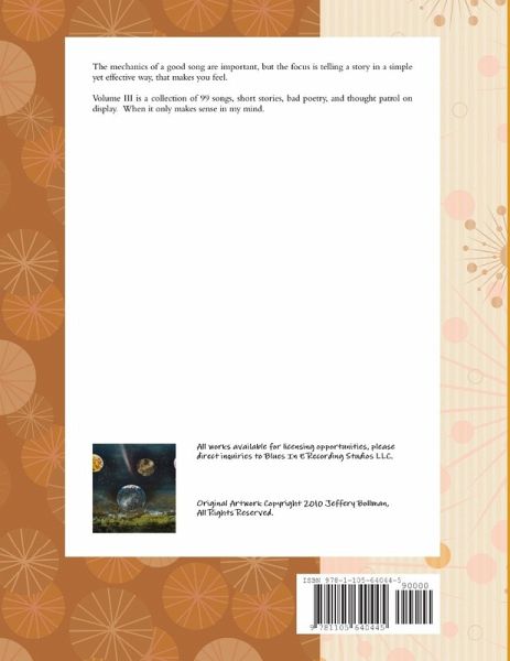 Blues in E Recording Studios LLC Lyrical Catalog Volume III is a collection of 99 songs, short stories, bad poetry and thought patrol on display. When it only makes sense in my mind. All works available for licensing and recording opportunities.