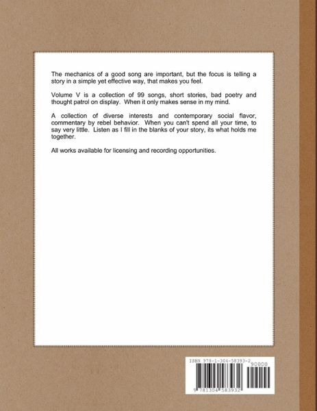 Blues In E Recording Studios LLC Lyrical Catalog Volume V is a collection of 99 songs, short stories, bad poetry and thought patrol on display. When it only makes sense in my mind. Available for licensing and recording opportunities.
