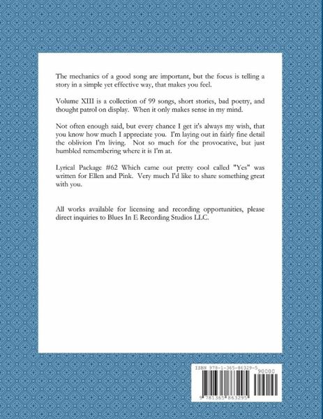 Blues In E Recording Studios LLC Lyrical Catalog Volume XIII is a collection of 99 songs, short stories, bad poetry, and thought patrol on display. When it only makes sense in my mind. All works available for licensing and recording.