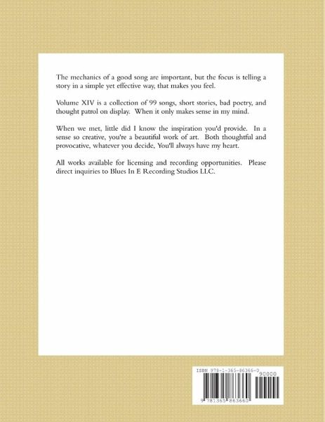 Blues In E Recording Studios LLC Lyrical Catalog Volume XIV is a collection of 99 songs, short stories, bad poetry, and thought patrol on display. When it only makes sense in my mind.