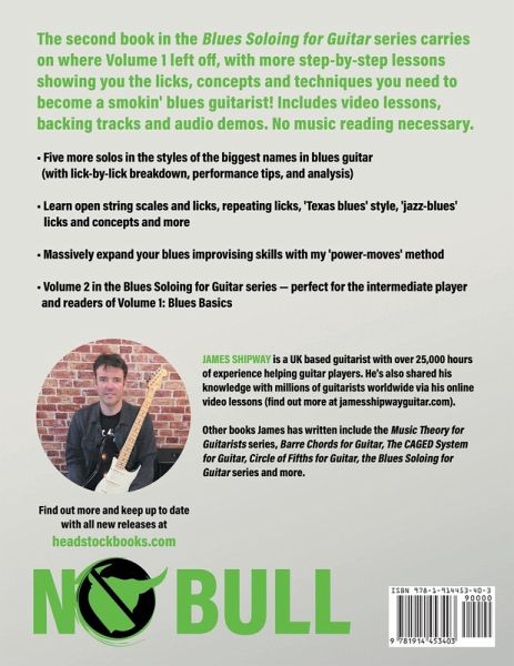 Volume 2 in the blues guitar book series gives you everything you need to know to play smokin' blues guitar. Packed with blues guitar licks and solos, essential blues guitar techniques, scales, and chords demonstrating some more advanced blues guitar concepts. With video lessons, backing tracks and audio demo tracks included, Blues Soloing for Guitar, Volume 2 is the perfect blues guitar book for intermediate level blues guitar players or beginner players who have completed Volume 1 in the series: Blues Basics. A complete blues guitar method book for intermediate guitar players who want to go beyond the basics of electric blues guitar and study some more advanced concepts Master the blues guitar techniques, licks and solos you need to sound like an authentic blues player. Taught step-by-step using 100% confusion-free language and with simple explanations See all the blues licks and solos demonstrated up close with the dedicated website featuring video lessons and easy to follow demonstrations at multiple speeds No music reading necessary: guitar tab, chord and fretboard diagrams make it easy to learn even if you can't read music Downloadable 'play-along' audio practice tracks and blues backing tracks Blues Soloing for Guitar, Volume 2 gives you a complete course for building on the basics of blues guitar. You'll learn: The 12 bar minor blues form plus variations Minor blues soloing and chord shapes Open string blues scales, Texas blues licks, jazz style blues licks ('jump blues' style) and more Complete blues solos in the styles of BB King, Stevie Ray Vaughan, T-Bone Walker, Albert King and other blues legends, complete with a lick-by-lick breakdown String bending, blues curls, vibrato, mixing major and minor sounds and other important blues techniques and approaches How to apply basic jazz concepts to your blues soloing (chord tones, 'minor 6' pentatonic etc.) How to jam and improvise your own tasty blues licks and solos (with my blues 'power moves' method) This book is perfect for you if: You want a blues guitar course for learning intermediate blues concepts without it being confusing and taking you years You want to play cool blues solos using a range of blues licks, techniques and approaches You are an intermediate blues guitar player who wants to brush up your skills, learn new techniques and build up your vocabulary of blues licks You want to feel more confident when you step up to play blues in your band or at a jam session You're fed up of trawling through millions of YouTube guitar lessons and want a proven, easy to use method to follow which will get you results So if you're ready to take your blues playing to a new level, then I'm looking forward to seeing you in Blues Soloing for Guitar, Volume 2: Levelling Up