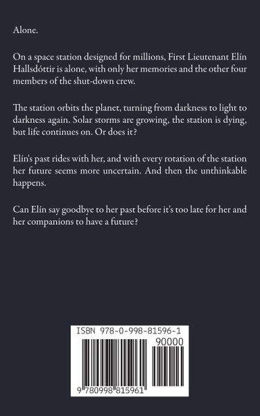 Alone. On a space station designed for millions, First Lieutenant Elín Hallsdóttir is alone, with only her memories and the other four members of the shut-down crew. The station orbits the planet, turning from darkness to light to darkness again. Solar storms are growing, the station is dying, but life continues on. Or does it? Elín's past rides with her, and with every rotation of the station her future seems more uncertain. And then the unthinkable happens. Can Elín say goodbye to her past before it's too late for her and her companions to have a future?