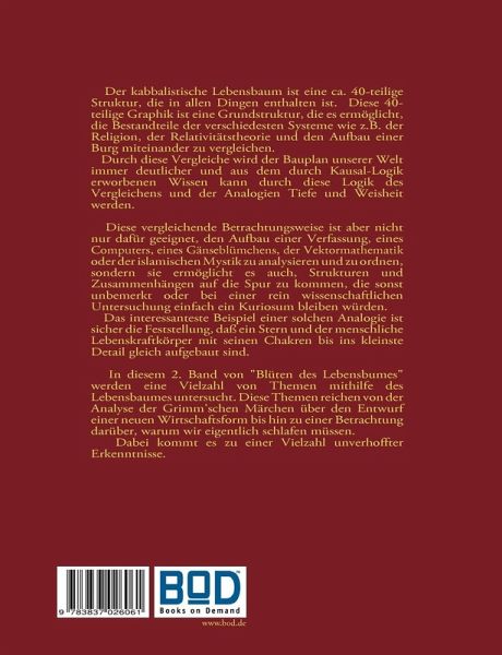 Der kabbalistische Lebensbaum ist eine ca. 40-teilige Struktur, die in allen Dingen enthalten ist. Diese 40-teilige Graphik ist eine Grundstruktur, die es ermöglicht, die Bestandteile der verschiedesten Systeme wie z.B. der Religion, der Relativitätstheorie und den Aufbau einer Burg miteinander zu vergleichen. Durch diese Vergleiche wird der Bauplan unserer Welt immer deutlicher und aus dem durch Kausal-Logik erworbenen Wissen kann durch diese Logik des Vergleichens und der Analogien Tiefe und Weisheit werden. Diese vergleichende Betrachtungsweise ist aber nicht nur dafür geeignet, den Aufbau einer Verfassung, eines Computers, eines Gänseblümchens, der Vektormathematik oder der islamischen Mystik zu analysieren und zu ordnen, sondern sie ermöglicht es auch, Strukturen und Zusammenhängen auf die Spur zu kommen, die sonst unbemerkt bleiben würden oder bei einer rein wissenschaftlichen Untersuchung einfach ein Kuriosum bleiben würden. Das interessanteste Beispiel einer solchen Analogie ist sicher die Feststellung, daß ein Stern und der menschliche Lebenskraftkörper mit seinen Chakren bis ins kleinste Detail gleich aufgebaut sind. In diesem 2. Band von "Blüten des Lebensbaumes" werden nun eine Vielzahl von Themen mithilfe des Lebensbaumes untersucht. Diese Themen reichen von der Analyse der Grimm'schen Märchen über den Entwurf einer neuen Wirtschaftsform bis hin zu einer Betrachtung darüber, warum wir eigentlich schlafen müssen. Dabei kkommt es zu einer
