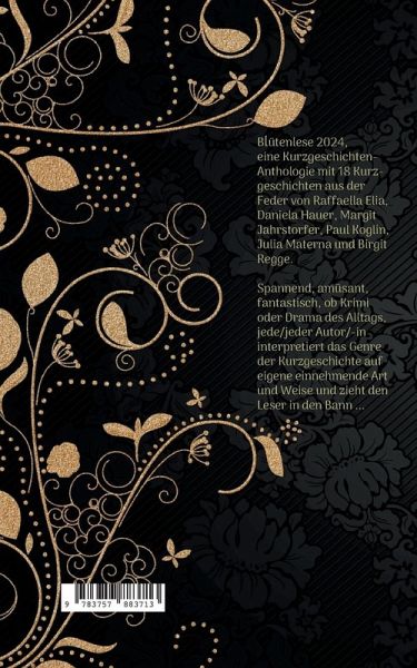 Blütenlese 2024, eine Kurzgeschichten-Anthologie mit 18 Kurzgeschichten aus der Feder von Raffaella Elia, Daniela Hauer, Margit Jahrstorfer, Paul Koglin, Julia Materna und Birgit Regge.Spannend, amüsant, fantastisch, ob Krimi oder Drama des Alltags, jede/jeder Autor/-in interpretiert das Genre der Kurzgeschichte auf ihre eigene einnehmende Art und Weise und zieht den Leser in ihren/seinen Bann ...