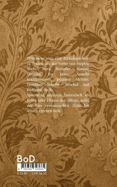 Blütenlese 2025, eine Anthologie mit 24 Texten aus der Feder von Stephie Abels, Bora Buonder, Simone Dettling, Ira Esser, Annelie Kuckhermann, Johanna Meister, Dorothee Schulte-Peschel und Wolfgang Steih. Spannend, amüsant, fantastisch, ob Krimi oder Drama des Alltags, jeder der hier versammelten Texte hat seinen eigenen Reiz.