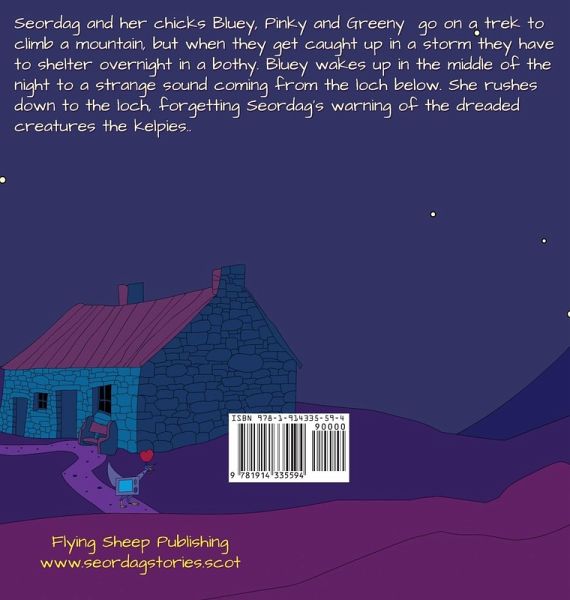 Seordag and her chicks Bluey, Pinky and Greeny go on a trek to climb a mountain, but when they get caught up in a storm they have to shelter overnight in a bothy. Bluey wakes up in the middle of the night to a strange sound coming from the loch below. She rushes down to the loch, forgetting Seordag's warning of the dreaded creatures the kelpies. Seordag Stories is a children's picturebook series of adventures about a cyborg hen and her friends, set in the Scottish Highlands.