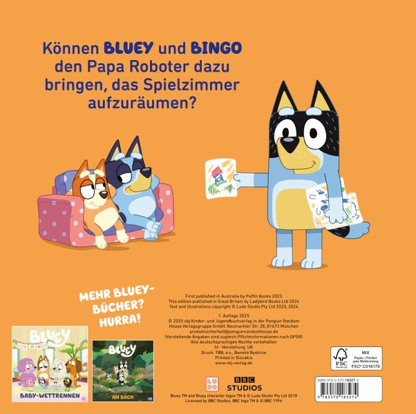 Nie wieder wollen Bluey und Bingo ihr Spielzimmer selbst aufräumen. Deswegen übergeben sie die Aufgabe an den Papa Roboter. Doch der schlaue Papa Roboter erkennt schnell, dass Bluey und Bingo der Grund für die ständige Unordnung im Spielzimmer ist. Aus diesem Grund will er sie in die Mülltone werfen ... Wird es den Mädchen gelingen, den Roboter neu zu programmieren, damit es nicht noch mehr Chaos gibt?