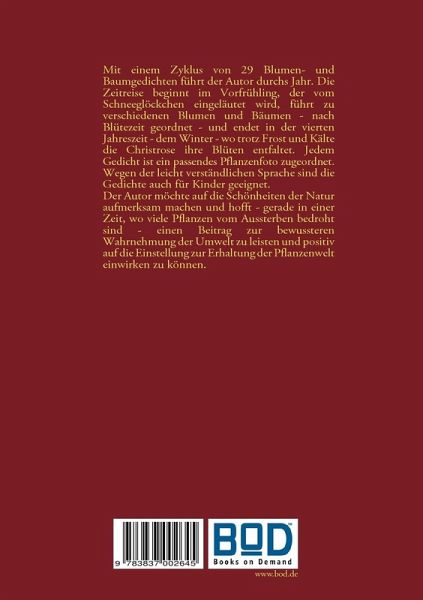 Mit einem Zyklus von 29 Blumen- und Baumgedichten führt der Autor durchs Jahr. Die Zeitreise beginnt im Vorfrühling, der vom Schneeglöckchen eingeläutet wird, führt zu verschiedenen Blumen und Bäumen - nach Blütezeit geordnet - und endet in der vierten Jahreszeit - dem Winter - wo trotz Frost und Kälte die Christrose ihre Blüten entfaltet. Jedem Gedicht ist ein passendes Pflanzenfoto zugeordnet. Wegen der leicht verständlichen Sprache sind die Gedichte auch für Kinder geeignet.Der Autor möchte auf die Schönheiten der Natur aufmerksam machen und hofft - gerade in einer Zeit, wo viele Pflanzen vom Aussterben bedroht sind - einen Beitrag zur bewussteren Wahrnehmung der Umwelt zu leisten und positiv auf die Einstellung zur Erhaltung der Pflanzenwelt einwirken zu können.