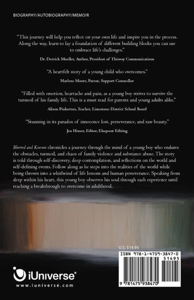 Blurred and Known chronicles a journey through the mind of a young boy who endures the obstacles, turmoil, and chaos of family violence and substance abuse. The story is told through self-discovery, deep contemplation, and reflections on the world and self-defining events. Follow along as he steps into the realities of the world while being thrown into a whirlwind of life lessons and human perseverance. Speaking from deep within his heart, this young boy observes his soul through each experience until reaching a breakthrough to overcome in adulthood.