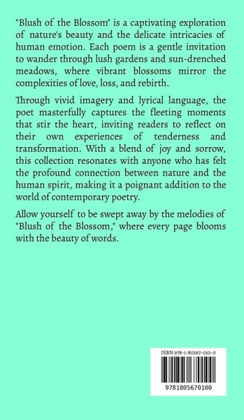 "Blush of the Blossom" is a captivating exploration of nature's beauty and the delicate intricacies of human emotion. Each poem is a gentle invitation to wander through lush gardens and sun-drenched meadows, where vibrant blossoms mirror the complexities of love, loss, and rebirth. Through vivid imagery and lyrical language, the poet masterfully captures the fleeting moments that stir the heart, inviting readers to reflect on their own experiences of tenderness and transformation. With a blend of joy and sorrow, this collection resonates with anyone who has felt the profound connection between nature and the human spirit, making it a poignant addition to the world of contemporary poetry. Allow yourself to be swept away by the melodies of "Blush of the Blossom," where every page blooms with the beauty of words.