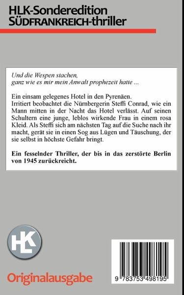 Und die Wespen stachen, ganz wie es mir mein Anwalt prophezeit hatte ...Ein einsam gelegenes Hotel in den Pyrenäen. Irritiert beobachtet die Nürnbergerin Steffi Conrad, wie ein Mann mitten in der Nacht das Hotel verlässt. Auf seinen Schultern eine junge, leblos wirkende Frau in einem rosa Kleid. Als Steffi sich am nächsten Tag auf die Suche nach ihr macht, gerät sie in einen Sog aus Lügen und Täuschung, der sie selbst in höchste Gefahr bringt.Ein fesselnder Thriller, der bis in das zerstörte Berlin von 1945 zurückreicht.
