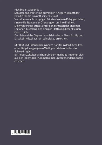 MäcBee ist wieder da ...Schulter an Schulter mit grimmigen Kriegern kämpft der Paladin für die Zukunft seiner Heimat.Von einem machthungrigen Fürsten in einen Krieg getrieben, ringen die Staaten der Grenzregion um ihre Freiheit.Die Welt erbebt erneut unter den Schritten der eisernen Legionen Tuscelans, der einzigen Hoffnung dieser kleinen Grenzreiche.Der listenreiche Gegner jedoch ist nahezu übermächtig und lässt kein Mittel aus, um sein ziel zu erreichen.Mit Blut und Eisen wird ein neues Kapitel in den Chroniken einer längst vergangenen Welt geschrieben, in der das Schwert regiert.Ein neues Zeitalter bricht an, in dem mächtige Imperien sich aus den lodernden Trümmern einer untergehenden Epoche erheben.