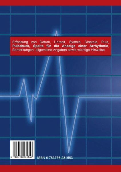 Blutdruck-Tagebuch zur Erfassung der Messwerte - alle Angaben, die sie brauchen.Diese Bücher oder Hefte gibt es zuhauf; eigentlich reicht ein liniertes Platt Papier für die wenigen Daten. Was aber oft als unzureichend zu bemängeln ist, dass neben den üblichen Spalten für Datum, Uhrzeit, Systole (oberer Wert) und Diastole (unterer Wert) oft nur noch der Puls zu finden ist und evtl. Platz für kurze Bemerkungen.Mittlerweile, und das schon seit einigen Jahren, nimmt auch der Wert für den Pulsdruck immer mehr an Bedeutung an. Neuere Messgeräte geben auch diesen an und werden dementsprechend beworben. Dies ist ein einfach selbst zu bestimmender Wert (oberer Wert minus unterer Wert), nur eine Spalte dafür bei den Aufzeichnungen sollte nicht fehlen.Bessere Geräte haben heute auch Arrhythmie-Erkennung und zeigen Herzrhythmusstörungen an. Dies ist natürlich bei häufigem Auftreten ein dringender Fall für den Arzt (wenn keine Messfehler vorliegen), sollte aber auch im Tagebuch erfasst werdenkönnen.Letztendlich gibt es noch eine Spalte für die Angabe, wo gemessen wurde (Oberarm links oder rechts, Handgelenk links oder rechts). Dies ist besonders nützlich, wenn man mehrere Geräte benutzt oder ausprobiert oder verschiedene Lagen ausprobiert.Für alles andere, das man eintragen will, ist eine neutrale Seite im Vorderteil reserviert. Dies ist meist zu individuell, als dass man hier starre Vorgaben machen sollte.Dazu gibt es einige wichtige Angaben zu der Bedeutung von Werten, die aber auch selbst komplettiert werden können, da es - zwar eingeschränkt - oft divergierende Angaben und Meinungen selbst im medizinischen Umfeld gibt.Auch hier die generelle Empfehlung: Nur der Arzt kann verlässliche Angaben machen, die auch individuelle Gegebenheiten berücksichtigen.Schließlich ist auch ein gelegentlicher Abgleich der eigenen Gerätschaften beim Arzt oder Apotheker angeraten, speziell aufgrund der vielen Geräte am Markt mit recht unterschiedlicher Qualität. Irgendwann ist auch eine Kalibrierung oder Entsorgung fällig.Erfassung von Datum, Uhrzeit, Systole, Diastole, Puls, Pulsdruck, Vermerk für das Vorliegen einer Arrhythmie, Bemerkungen, allgemeine Angaben.Taschenbuch, DIN A5 Hochformat, Seiten zur Erfassung innen im Querformat für mehr Platz, genügend Spalten für Einträge weit über ein Jahr hinaus bei drei Messungen am Tag.