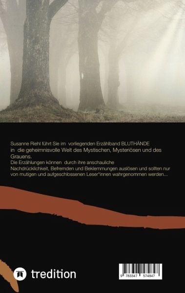 Science Fiction, Fantasy, Krimi und Horror vom Allerfeinsten bietet Susanne Riehl in ihrem neuen spannenden Erzählband "BLUTHÄNDE" !"Dreamwatching" führt einen Pharmamanager in die virtuelle und magische Welt seines eigenen Sexus."Was ist los mit Aja" gibt einen Einblick in die beklemmende schulische Welt der nahen Zukunft.In "Die drei Freundinnen" begegnet uns ein mysteriöser und mystischer Kriminalfall, in den drei junge Abiturientinnen verwickelt sind. "Schuldig" berührt anhand des Schicksals eines Straffälligen die ewig menschliche philosophische Frage von Schuld, Erbschuld und Karma.Die "Indischen Nacht in Deia" lässt ein junges Liebespaar Einblick nehmen in die fantastische Welt von Zeit und Schicksal.Im "Blutnetz der Nacht" treibt ein junger Vampir sein medizinisches Unwesen."Das Pestbild " ist eine mystische Kriminalgeschichte im Kunstraubmilieu.In "Shamira" begegnet eine Ärztin völlig unerwartet dem Unheimlichen."Weihnachtsmarkt" offenbart eine beklemmende Geschichte, in der sich Realität und Psychopathologisches auf schreckliche Weise vereinen.