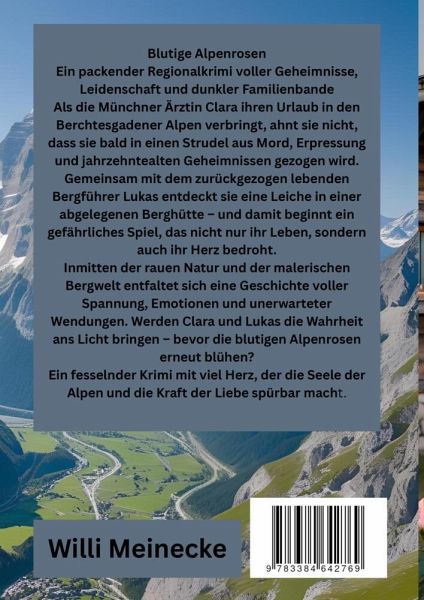 "Blutige Alpenrosen" erzählt die spannende Geschichte von Clara, einer Münchner Ärztin, die ihren Urlaub im Berchtesgadener Land verbringt. Dort trifft sie auf Lukas, einen zurückgezogen lebenden Bergführer. Gemeinsam entdecken sie in einer abgelegenen Berghütte eine Leiche - der Auftakt zu einem gefährlichen Strudel aus alten Familiengeheimnissen, Erpressung und Mord.Während sie versuchen, die Wahrheit hinter dem mysteriösen Tod aufzudecken, geraten sie immer tiefer in ein Netz aus Lügen und Intrigen, das bis in die Vergangenheit der beiden verfeindeten Familien reicht. Die raue Natur der Alpen bildet die dramatische Kulisse für die Ermittlungen, die nicht nur ihr Leben, sondern auch ihre aufkeimende Liebe auf eine harte Probe stellen.Zwischen gefährlichen Situationen, emotionalen Konflikten und überraschenden Wendungen kämpfen Clara und Lukas darum, die dunklen Geheimnisse ans Licht zu bringen und dabei ihre Gefühle füreinander nicht zu verlieren. Am Ende steht nicht nur die Aufklärung des Mordes, sondern auch ein Neuanfang - für sie selbst und das ganze Dorf.