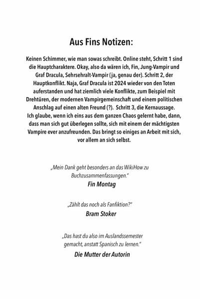 Aus Fins Notizen: Keinen Schimmer, wie man sowas schreibt. Online steht, Schritt 1 sind die Hauptcharaktere. Okay, also da wäre ich, Fin, Jung-Vampir und Graf Dracula (ja, genau der). Schritt 2, der Hauptkonflikt. Naja, Graf Dracula ist 2024 wieder von den Toten auferstanden und hat ziemlich viele Konflikte, zum Beispiel mit Drehtüren, der modernen Vampirgemeinschaft und einem politischen Anschlag auf einen alten Freund (?). Schritt 3, die Kernaussage. Ich glaube, wenn ich eins aus dem Chaos gelernt habe, dann, dass man sich gut überlegen sollte, sich mit einem der mächtigsten Vampireever anzufreunden. Das bringt so einiges an Arbeit mit sich, vor allem an sich selbst.