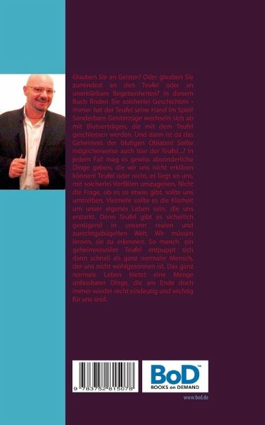 Glauben Sie an Geister? Oder glauben Sie zumindest an den Teufel oder an unerklärbare Begebenheiten? In diesem Buch finden Sie solcherlei Geschichten - immer hat der Teufel seine Hand im Spiel! Sonderbare Geisterzüge wechseln sich ab mit Blutverträgen, die mit dem Teufel geschlossen werden. Und dann ist da das Geheimnis der blutigen Oblaten! Sollte möglicherweise auch hier der Teufel ...? In jedem Fall mag es gewiss absonderliche Dinge geben, die wir uns nicht erklären können! Teufel oder nicht, es liegt an uns, mit solcherlei Vorfällen umzugehen. Nicht die Frage, ob es so etwas gibt, sollte uns umtreiben. Vielmehr sollte es die Klarheit um unser eigenes Leben sein, die uns erstarkt. Denn Teufel gibt es sicherlich genügend in unserer realen und zurechtgebügelten Welt. Wir müssen lernen, sie zu erkennen. So manch ein geheimnisvoller Teufel entpuppt sich dann schnell als ganz normaler Mensch, der uns nicht wohlgesonnen ist. Das ganz normale Leben bietet eine Menge unfassbarer Dinge, die am Ende doch immer wieder recht eindeutig und wichtig für uns sind.