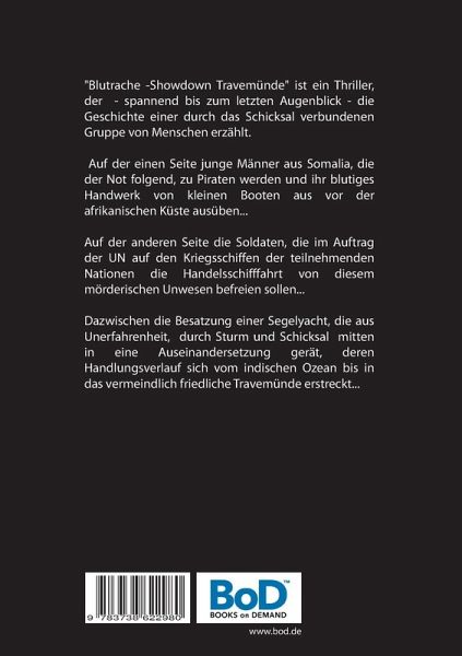 "Blutrache -Showdown Travemünde" ist ein Thriller, der - spannend bis zum letzten Augenblick - die Geschichte einer durch das Schicksal verbundenen Gruppe von Menschen erzählt.Auf der einen Seite junge Männer aus Somalia, die der Not folgend, zu Piraten werden und ihr blutiges Handwerk von kleinen Booten aus vor der afrikanischen Küste ausüben ...Auf der anderen Seite die Soldaten, die im Auftrag der UN auf den Kriegsschiffen der teilnehmenden Nationen die Handelsschifffahrt von diesem mörderischen Unwesen befreien sollen ...Dazwischen die Besatzung einer Segelyacht, die aus Unerfahrenheit, durch Sturm und Schicksal mitten in eine Auseinandersetzung gerät, deren Handlungsverlauf sich vom indischen Ozean bis in das vermeintlich friedliche Travemünde erstreckt ...