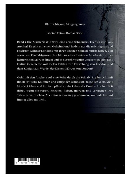 Blutrot bis zum Morgengrauen ist eine Krimi- Roman Serie.Band 1 Die Atschers: Wie wird eine arme Schneiders Tochter zur Lady Atscher? Es geht um einen Geheimbund, in dem nur die mächtigsten und reichsten Männer Londons mit ihren ältesten Söhnen Zutritt haben. Von sexuellen Erniedrigungen bis hin zu einer brutalen Mordserie, in der keiner einen Mörder findet und es nur sehr wenige Verdächtige gibt. Eine fiktive Geschichte mit vielen Fakten zur Entstehung von London und dem Königshaus. Wer ist der Dirnen-Mörder von London? Geht mit den Atschers auf eine Reise durch die Zeit ab 1834, besucht mit ihnen britische Kolonien und einige der schönsten Städte der Welt. Viele Morde, Lieben und Intrigen pflastern das Leben der Familie Atscher. Seit dabei, wenn sie reisen, heiraten, lieben, morden und versuchen ihre Taten zu vertuschen. Aber eins sei vorweg genommen, am Ende kommt immer alles ans Licht.