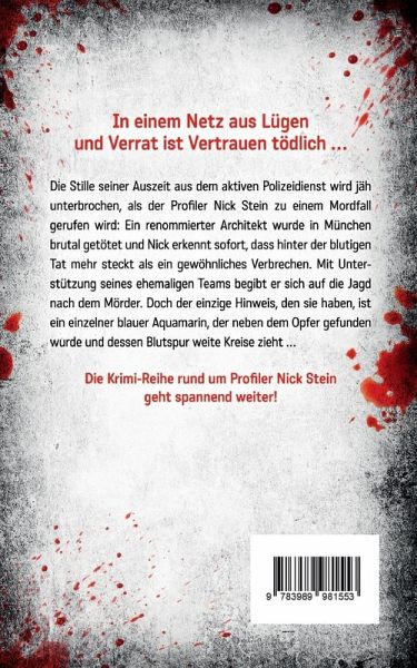 In einem Netz aus Lügen und Verrat ist Vertrauen tödlich … Die Krimi-Reihe rund um Profiler Nick Stein geht spannend weiter! Die Stille seiner Auszeit aus dem aktiven Polizeidienst wird jäh unterbrochen, als der Profiler Nick Stein zu einem Mordfall gerufen wird: Ein renommierter Architekt wurde in München brutal getötet und Nick erkennt sofort, dass hinter der blutigen Tat mehr steckt als ein gewöhnliches Verbrechen. Mit Unterstützung seines ehemaligen Teams begibt er sich auf die Jagd nach dem Mörder. Doch der einzige Hinweis, den sie haben, ist ein einzelner blauer Aquamarin, der neben dem Opfer gefunden wurde und dessen Blutspur weite Kreise zieht … Dies ist eine überarbeitete Neuausgabe des bereits erschienenen Titels Totenstein. Weitere Titel in der Reihe Seelennarben (ISBN: 9783989980846) Schmerzensstille (ISBN: 9783989981294) Erste Leser:innenstimmen „Ein sorgsam konstruierter Krimi, der nie an Spannung verliert." „Zum Glück ist Nick Stein kein Typ für den Ruhestand. Auch sein dritter Fall ist wieder rätselhaft, komplex und unglaublich fesselnd." „Als Krimi-Fan war ich begeistert und habe zu jedem Zeitpunkt mit dem Ermittlerteam mitgefiebert." „Ein mitreißender Kriminalfall voller interessanter Wendungen."