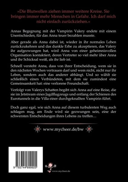 Annas Begegnung mit der Vampirin Valery endete mit einem Unentschieden, für das Anna teuer bezahlen musste.Aber gerade als Anna dabei ist, wieder in ihr normales Leben zurückzukehren und das dunkle Erbe zu akzeptieren, das Valery ihr aufgezwungen hat, wird Anna von einer geheimnisvollen Organisation kontaktiert, deren Vertreter so viel mehr über Anna und ihr Schicksal weiß, als ihr lieb ist.Schnell versteht Anna, dass von ihrer Entscheidung, wem sie in den nächsten Wochen vertrauen darf und wem nicht, nicht nur ihr Leben, sondern auch das anderer abhängt. Und so wählt sie schließlich einen Verbündeten, mit dem sie zumindest eine Gemeinsamkeit hat: eine verlorene Freundschaft.Verfolgt von Valerys Schatten begibt sich Anna auf eine Reise, die sie im Jetstream eines Jagdflugzeugs und entlang der Schienen des Eurotunnels in die Villa einer durchgeknallten Vampirin führt.Doch ganz egal, wie sich Anna auf diesem turbulenten Weg auch schlagen mag, am Ende wird sie gezwungen sein, eine der schwersten Entscheidungen ihres Lebens zu treffen ...