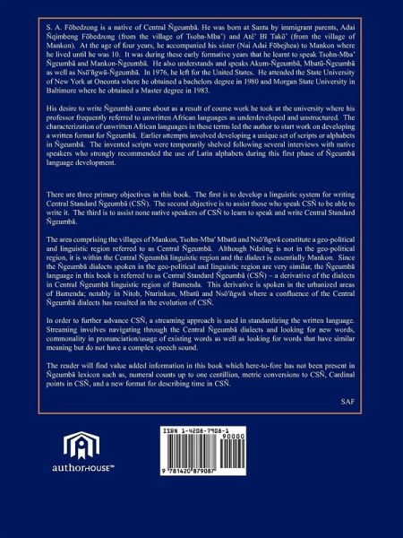 There are three primary objectives in this book. The first is to develop a linguistic system for writing Central Standard ¿geumba (CS¿). The second objective is to assist those who speak CS¿ to be able to write it. The third is to assist none native speakers of CS¿ to learn to speak and write Central Standard ¿geumba. The area comprising the villages of Mankon, Tsohn-Mba' Mbatu and Nso'ñgwa constitute a geo-political and linguistic region referred to as Central ¿geumba. Although Ndzöng is not in the geo-political region, it is within the Central ¿geumba linguistic region and the dialect is essentially Mankon. Since the ¿geumba dialects spoken in the geo-political and linguistic region are very similar, the ¿geumba language in this book is referred to as Central Standard ¿geumba (CS¿) - a derivative of the dialects in Central ¿geumba linguistic region of Bamenda. This derivative is spoken in the urbanized areas of Bamenda; notably in Nitob, Ntarinkon, Mbatu and Nsö'ñgwa where a confluence of the Central ¿geumba dialects has resulted in the evolution of CS¿. In order to further advance CS¿, a streaming approach is used in standardizing the written language. Streaming involves navigating through the Central ¿geumba dialects and looking for new words, commonality in pronunciation/usage of existing words as well as looking for words that have similar meaning but do not have a complex speech sound. The reader will find value added information in this book which here-to-fore has not been present in ¿geumba lexicon such as, numeral counts up to one centillion, metric conversions to CS¿, Cardinal points in CS¿, and a new format for describing time in CS¿. SAF