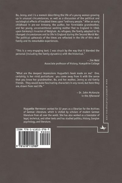 Bo, Jenny and I is a memoir describing the life of a young woman growing up in unusual circumstances, as well as a discussion of political and sociological effects of troubled times upon "ordinary people." After an early childhood in pre-war Antwerp, the author, her formidable grandmother, and her young, unconventional working mother fled to England in 1940, upon Germany's invasion of Belgium. As refugees, the family adapted to its changed circumstances and to life in World War II England. The political upheavals of the times are reflected in the life of this small family and its remarkable experiences.