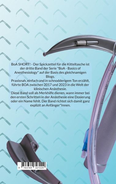 BoA SHORT! - Der Spickzettel für die Kitteltasche ist der dritte Band der Serie "BoA - Basics of Anesthesiology" auf der Basis des gleichnamigen Blogs. Praxisnah, einfach und in schnodderigem Ton erzählt, führte BOA zwischen 2017 und 2023 in die Welt der klinischen Anästhesie. Diese Band soll nun als Merkhilfe dienen, wann immer bei den ersten Schritten in der Anästhesie eine Dosierung oder ein Name fehlt. Der Band richtet sich damit ganz explizit an Anfänger*Innen. Ursprünglich mal das "Kittelbuch" des Autors ist der Spicker jetzt sein Standardhandout für Praktikant*Innen, Famuli/-ae und Assistent*Innen für die ersten Schritte im spannenden Feld der klinischen Anästhesie.