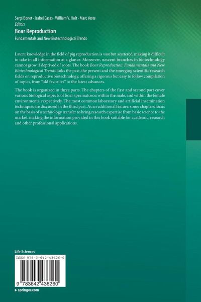 Latent knowledge in the field of pig reproduction is vast but scattered, making it difficult to take in all information at a glance. Moreover, nascent branches in biotechnology cannot grow if deprived of roots. The book Boar Reproduction: Fundamentals and New Biotechnological Trends links the past, the present and the emerging scientific research fields on reproductive biotechnology, offering a rigorous but easy to follow compilation of topics, from "old favorites" to the latest advances.