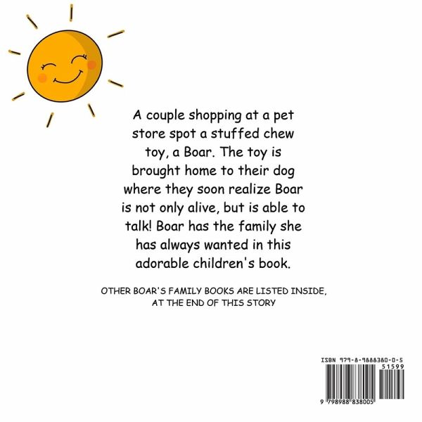 Boar and Family BooksAre based upon true stories. We envision that readers from age two to 102 will delight in getting to know Boar's family. We suggest getting someone on your lap to turn pages as you read and jump into the world of Boar and the family. Book 1 -Back StoryYears ago, Cindy had a black lab. Martha was adorable and well behaved. Cindy worked in a nursing home and would bring Martha to work as a therapy dog for the residents. One day Cindy and I went to a pet food store to get Martha some food. There, we found a stuffed dog chew toy. It was a Boar. We brought Boar home. Martha, the dog, played with her pretty tough, & caused the toy to squawk! Boar had a squeeze box in her. Well, she was so darn cute, we would not let Martha play with her anymore. Boar became a daughter to us. Books 2-4- Back StoriesSince then, we have acquired Junior, a Gecko from the Rain Forest Cafe, and Hardy a bear from the state fair. They each have a personality of their own. These three have been our kids since 2010 or so. We would tell Cindy's mom what our kids were doing and she would just laugh and chuckle. Cindy's mom, (kid's grandma) has told us early on that we should write these stories down. Well, this year, 2023, we started to do that. Cindy is the illustrator; I am the author.We hope you enjoy the antics and love of our family as much as we do.