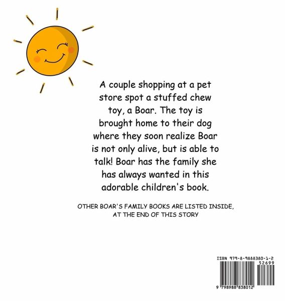 Boar and Family BooksAre based upon true stories. We envision that readers from age two to 102 will delight in getting to know Boar's family. We suggest getting someone on your lap to turn pages as you read and jump into the world of Boar and the family. Book 1 -Back StoryYears ago, Cindy had a black lab. Martha was adorable and well behaved. Cindy worked in a nursing home and would bring Martha to work as a therapy dog for the residents. One day Cindy and I went to a pet food store to get Martha some food. There, we found a stuffed dog chew toy. It was a Boar. We brought Boar home. Martha, the dog, played with her pretty tough, & caused the toy to squawk! Boar had a squeeze box in her. Well, she was so darn cute, we would not let Martha play with her anymore. Boar became a daughter to us. Books 2-4- Back StoriesSince then, we have acquired Junior, a Gecko from the Rain Forest Cafe, and Hardy a bear from the state fair. They each have a personality of their own. These three have been our kids since 2010 or so. We would tell Cindy's mom what our kids were doing and she would just laugh and chuckle. Cindy's mom, (kid's grandma) has told us early on that we should write these stories down. Well, this year, 2023, we started to do that. Cindy is the illustrator; I am the author.We hope you enjoy the antics and love of our family as much as we do.