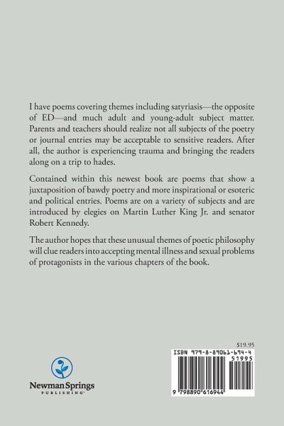 I have poems covering themes including satyriasis--the opposite of ED--and much adult and young-adult subject matter. Parents and teachers should realize not all subjects of the poetry or journal entries may be acceptable to sensitive readers. After all, the author is experiencing trauma and bringing the readers along on a trip to hades. Contained within this newest book are poems that show a juxtaposition of bawdy poetry and more inspirational or esoteric and political entries. Poems are on a variety of subjects and are introduced by elegies on Martin Luther King Jr. and senator Robert Kennedy. The author hopes that these unusual themes of poetic philosophy will clue readers into accepting mental illness and sexual problems of protagonists in the various chapters of the book.