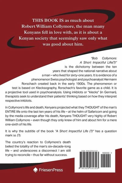 This book is as much about Robert William Collymore, the man many Kenyans fell in love with, as it is about a Kenyan society that seemingly saw only what was good about him. "Bob Collymore: A Short Impactful Life(?)" is the dichotomy between the ten years that shaped the national narrative about a man - who lived for sixty-one years. It is evidence of a phenomenon Swiss psychologist and psychoanalyst Hermann Rorschach created back in the early 1900s. The phenomenon or test is based on Klecksography, Rorschach's favorite game as a child. It is a projective tool used in psychoanalysis. Using inkblots or "klecks" (in German), therapists seek to understand their patients' thinking based on how they interpret respective inkblots. In Collymore's life and death, Kenyans projected what they THOUGHT of the man's ENTIRE life onto the last ten years of his life - at the helm of Safaricom and going by the media coverage after his death, Kenyans THOUGHT very highly of Robert William Collymore - even though they only knew of him and about him for a mere one-sixth of his life. It is why the subtitle of the book "A Short Impactful Life (?)" has a question mark i.e. (?): The country's reaction to Collymore' death belied the totality of the man's six-decade-long life - and underscores a disconnect I am trying to reconcile - thus far without success.
