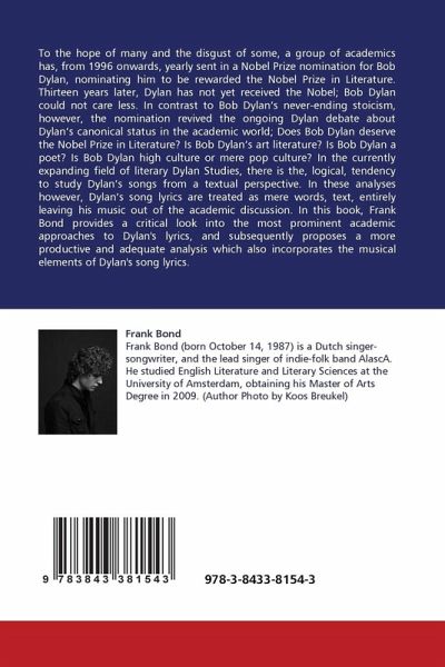 To the hope of many and the disgust of some, a group of academics has, from 1996 onwards, yearly sent in a Nobel Prize nomination for Bob Dylan, nominating him to be rewarded the Nobel Prize in Literature. Thirteen years later, Dylan has not yet received the Nobel; Bob Dylan could not care less. In contrast to Bob Dylan's never-ending stoicism, however, the nomination revived the ongoing Dylan debate about Dylan's canonical status in the academic world; Does Bob Dylan deserve the Nobel Prize in Literature? Is Bob Dylan's art literature? Is Bob Dylan a poet? Is Bob Dylan high culture or mere pop culture? In the currently expanding field of literary Dylan Studies, there is the, logical, tendency to study Dylan's songs from a textual perspective. In these analyses however, Dylan's song lyrics are treated as mere words, text, entirely leaving his music out of the academic discussion. In this book, Frank Bond provides a critical look into the most prominent academic approaches to Dylan's lyrics, and subsequently proposes a more productive and adequate analysis which also incorporates the musical elements of Dylan's song lyrics.