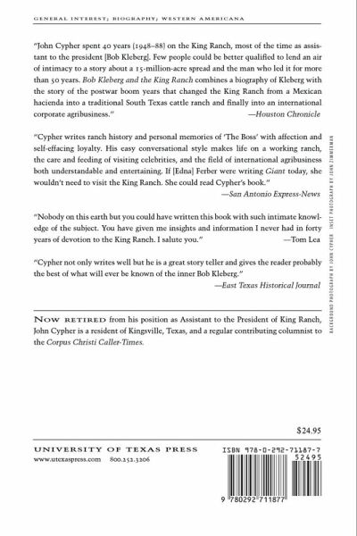 Ranching on the vast scale that Texas is famous for actually happened at King Ranch, a sea of grass that ultimately spread its pastures to countries around the globe under the fifty-year leadership of Bob Kleberg. This absorbing biography, written by Kleberg's top assistant of many years, captures both the life of the man and the spirit of the kingdom he ruled, offering a rare, insider's view of life on a fabled Texas ranch. John Cypher spent forty years (1948-1988) on King Ranch. In these pages, he melds highlights of Kleberg's life with memories of his own experiences as the "right hand" who implemented many of Kleberg's grand designs. In a lively story laced with fascinating anecdotes he both recounts his worldwide travels with Kleberg as the ranch expanded its holdings to Latin America, Cuba, Australia, the Philippines, Europe, and Africa, and describes timeless, traditional tasks such as roundup at the home ranch in Kingsville. Kleberg's accomplishments as the founder of the Santa Gertrudis cattle breed and a breeder of Thoroughbred racing horses receive full attention, as does his fabled lifestyle, which included friendships not merely with the rich and famous but also with Queen Elizabeth the Queen Mother, who shared his love of horse racing. For everyone interested in ranching and one of its most famous practitioners, this book will be essential reading.