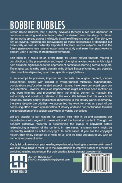 NEW PRINT WITH PROFESSIONAL TYPE-SET IN CONTRAST TO SCANNED PRINTS OFFERED BY OTHERS Bobbie Bubbles This book is a result of an effort made by us towards making a contribution to the preservation and repair of original classic literature. In an attempt to preserve, improve and recreate the original content, we have worked towards: 1. Type-setting & Reformatting: The complete work has been re-designed via professional layout, formatting and type-setting tools to re-create the same edition with rich typography, graphics, high quality images, and table elements, giving our readers the feel of holding a 'fresh and newly' reprinted and/or revised edition, as opposed to other scanned & printed (Optical Character Recognition - OCR) reproductions. 2. Correction of imperfections: As the work was re-created from the scratch, therefore, it was vetted to rectify certain conventional norms with regard to typographical mistakes, hyphenations, punctuations, blurred images, missing content/pages, and/or other related subject matters, upon our consideration. Every attempt was made to rectify the imperfections related to omitted constructs in the original edition via other references. However, a few of such imperfections which could not be rectified due to intentional\unintentional omission of content in the original edition, were inherited and preserved from the original work to maintain the authenticity and construct, relevant to the work. We believe that this work holds historical, cultural and/or intellectual importance in the literary works community, therefore despite the oddities, we accounted the work for print as a part of our continuing effort towards preservation of literary work and our contribution towards the development of the society as a whole, driven by our beliefs. We are grateful to our readers for putting their faith in us and accepting our imperfections with regard to preservation of the historical content. HAPPY READING!