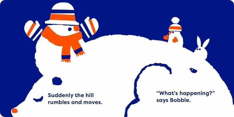 A sweet and simple story about fun and friendship, featuring Bobble and Pom Pom, who love to have fun and play in the snow. One day Bobble and Pom Pom climb up a new hill and admire the view, when suddenly the hill rumbles and moves. It wasn't a hill at all–it was a sleeping, snowy polar bear! Bobble and Pom Pom and their friends Bunny and Bird have fun sliding down Polar Bear's back, and at the end of the day they roll snowballs and make a shelter for Polar Bear to sleep in peace. The snowy setting makes for a lovely seasonal gift year after year.